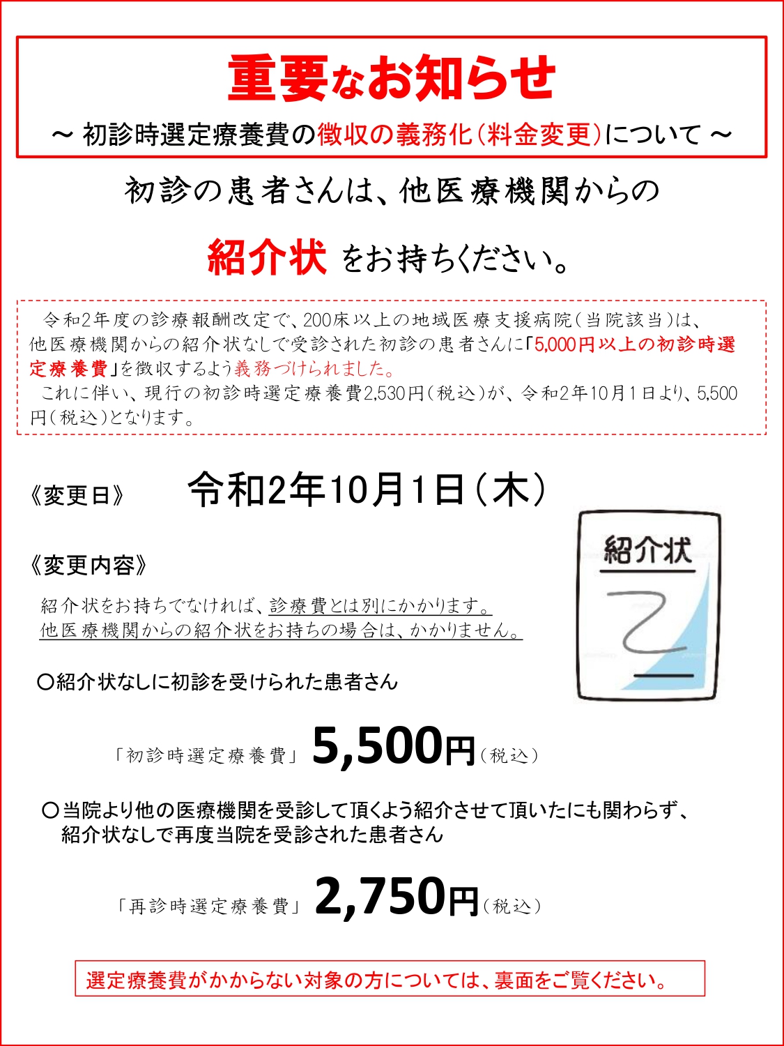 【重要】初診時選定療養費の料金変更について