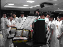 災害の研修では、DMATの医師より、研修があり実際に使用しているバッグや医療材料など見せてもらい、災害について興味を持つものが多くいました。