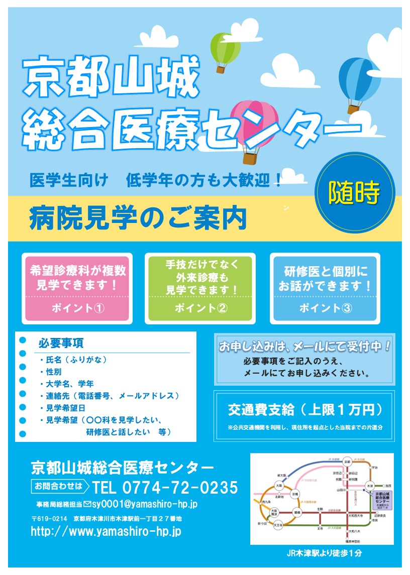 木津駅は鉄道の要所で、京都、大阪にもアクセスが良いところです。皆さん、きっと充実した研修が送れると思います。2017年から基幹型臨床研修病院となりました。皆様と学び合うことができたら嬉しいです。ご興味のある方はご一緒に学びましょう。